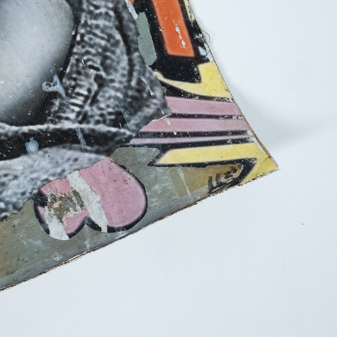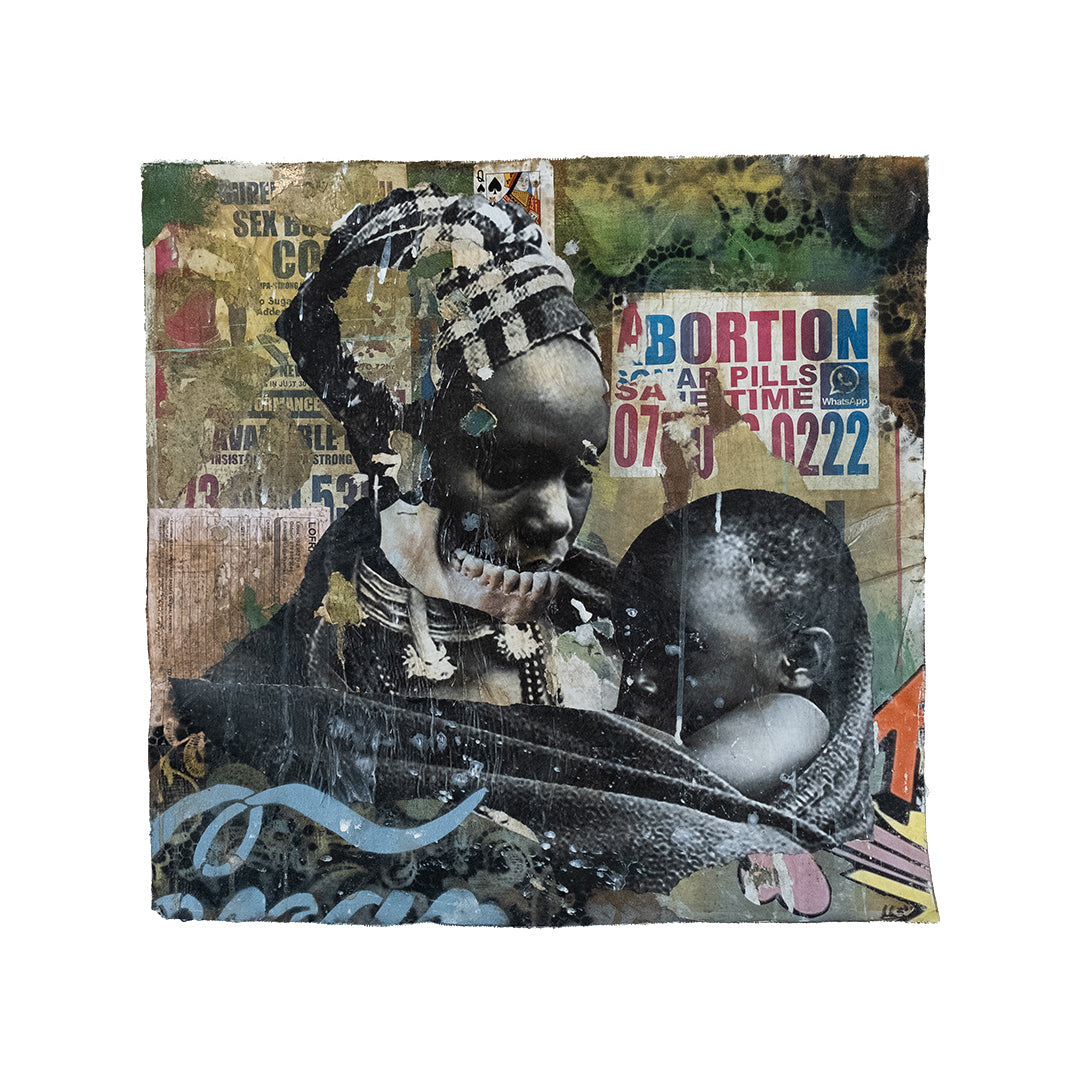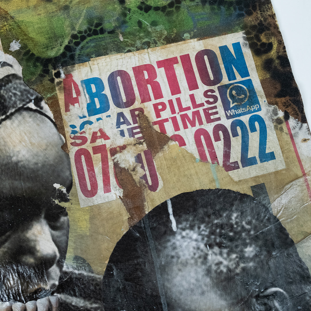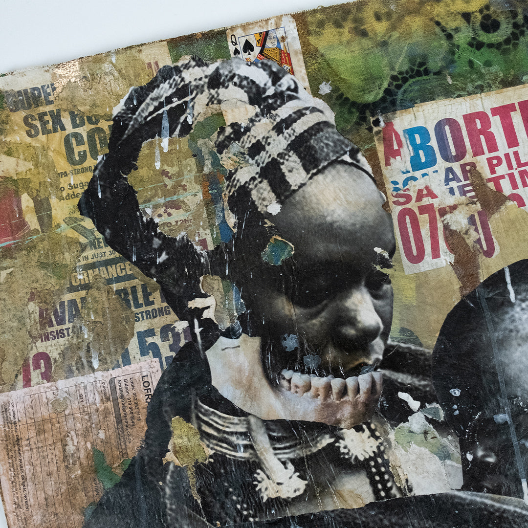 Mncedi Madolo draws from print ads and magazine covers to satirize his attempts at selling fast solutions to complex problems. Mncedi’s s layered works are of mixed-media underscores which depict the impact of advertisements on South African identity and it’s physical urban landscapes.