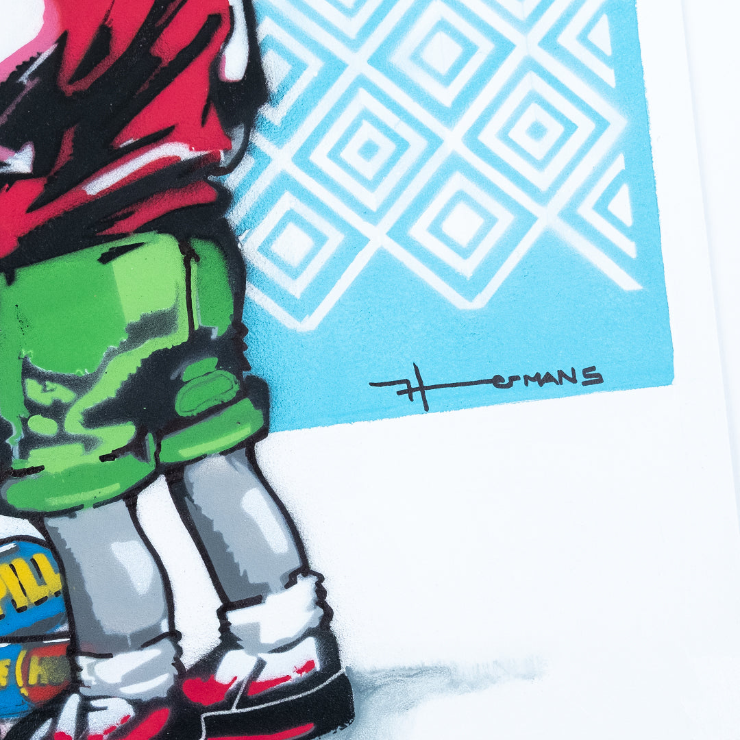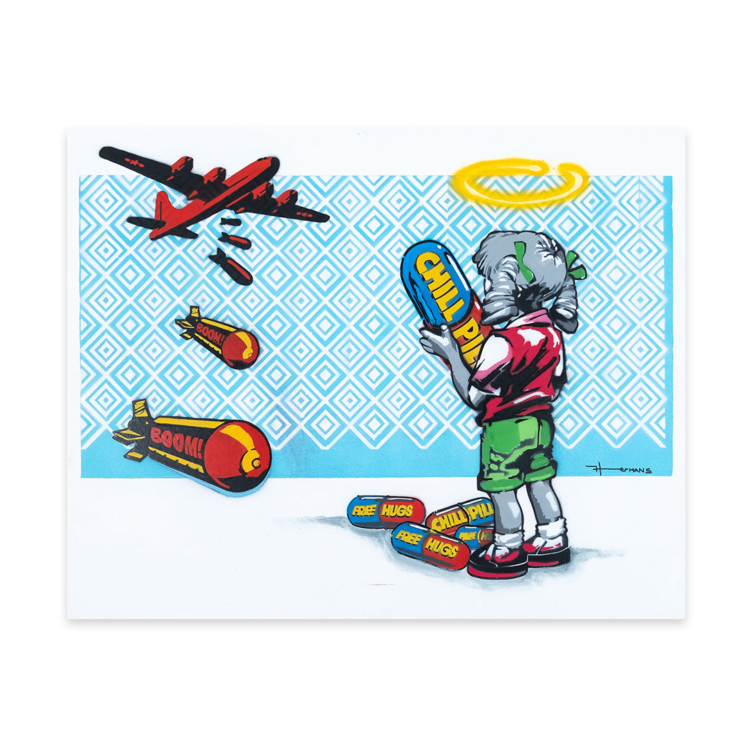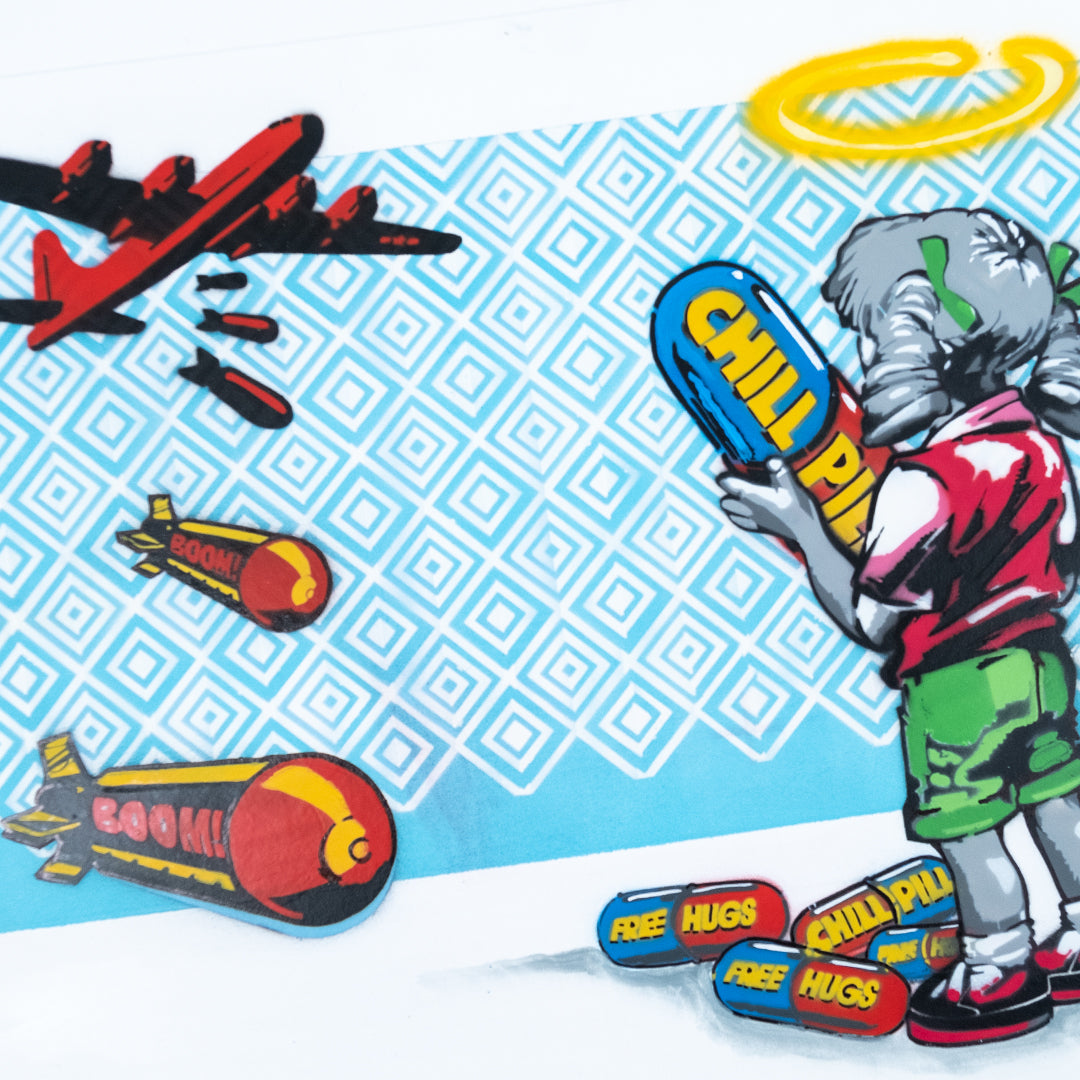 Dropping Bombs I by Fadiel Hermans. Spraypaint, stencil and mixed media on stock board. Edition of 1. 20 x 25 Inches. This RUN comes signed with a Letter of Provenance.