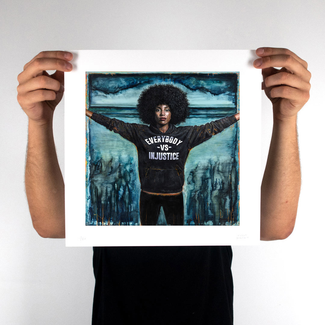 Everybody Vs. Injustice - Standard Edition. Archival Pigment Print on 290gsm Moab Entrada Fine Art Paper. Edition of 100. 14 x 14 Inches. This RUN is signed, numbered and comes with a Certificate of Authenticity from Tim Okamura and 1xRUN.