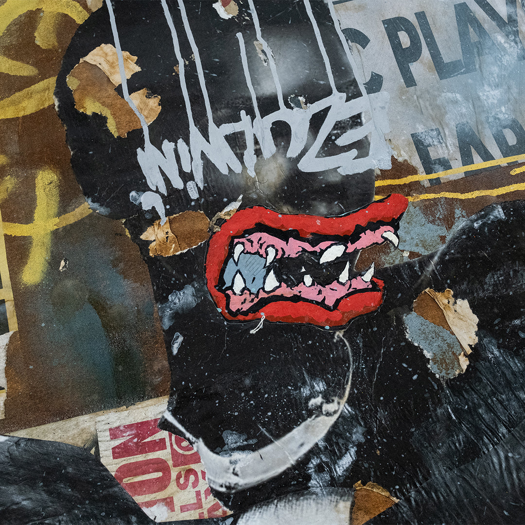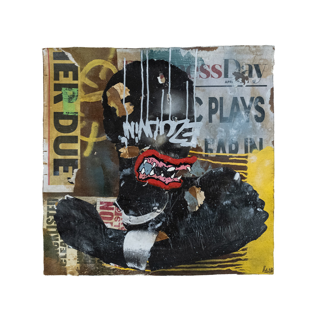 Mncedi Madolo draws from print ads and magazine covers to satirize his attempts at selling fast solutions to complex problems. Mncedi’s s layered works are of mixed-media underscores which depict the impact of advertisements on South African identity and it’s physical urban landscapes.