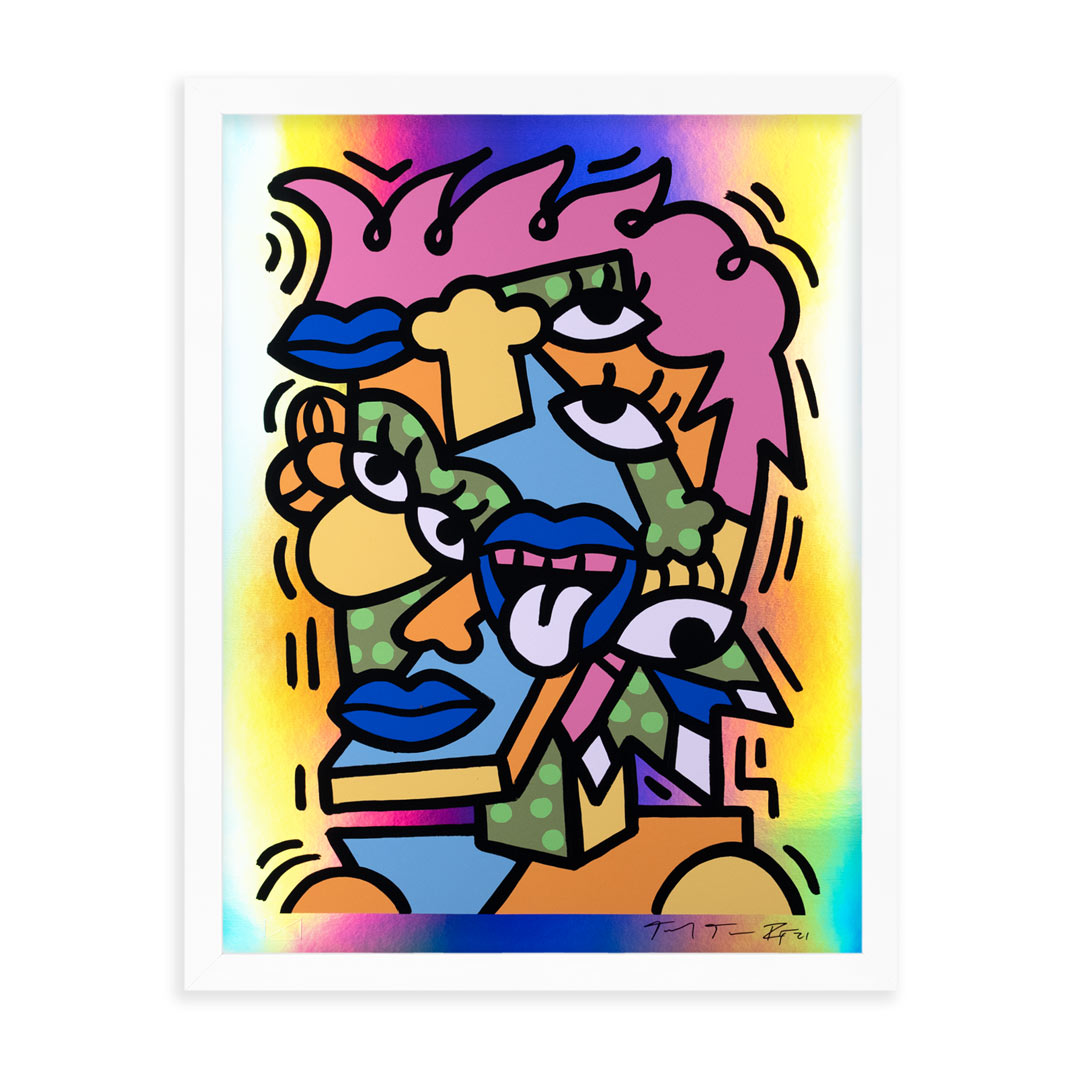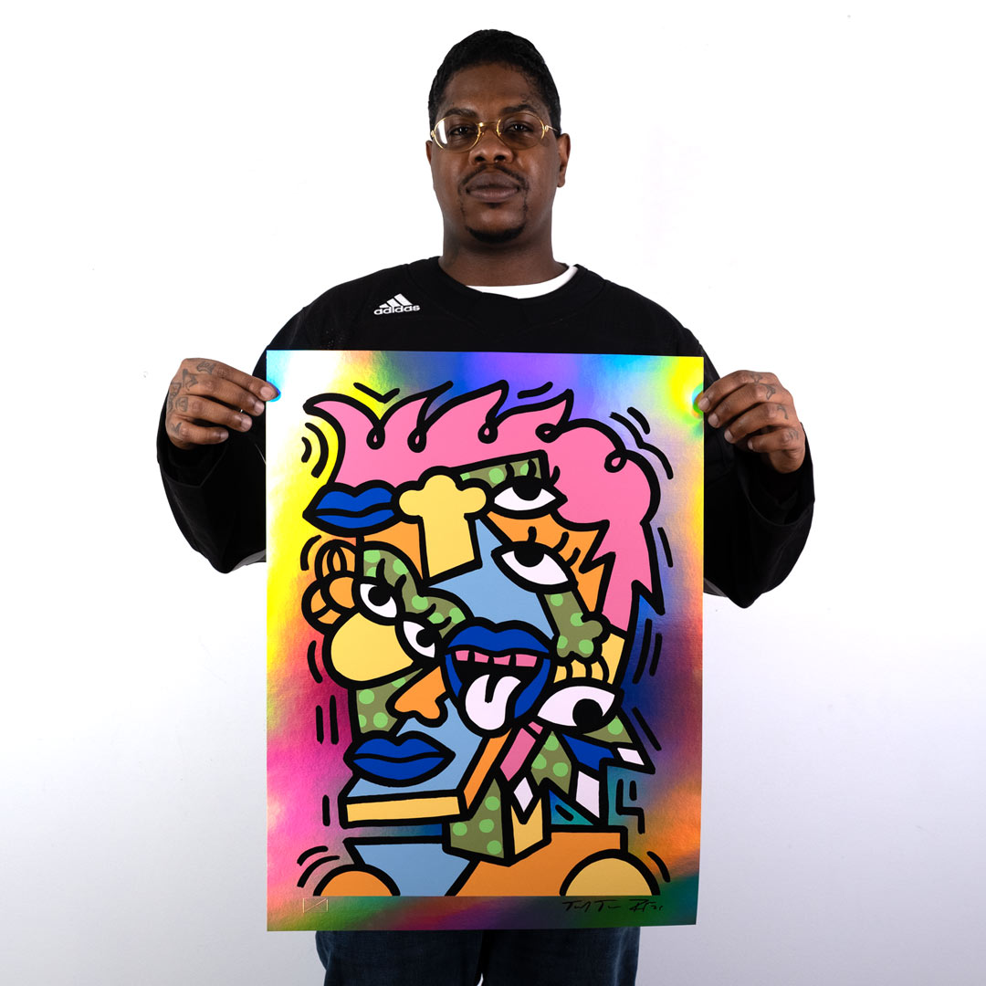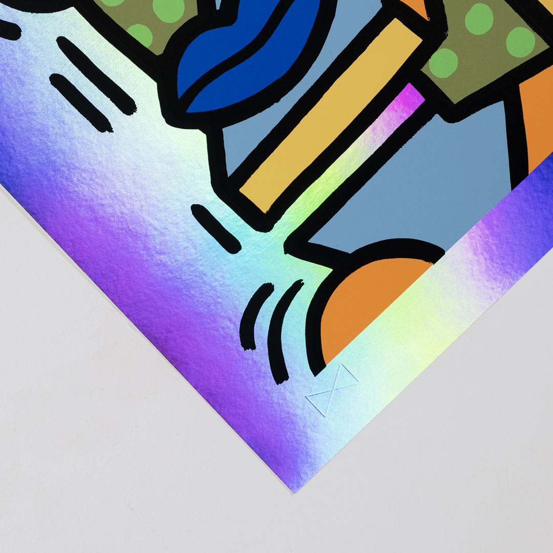 Freak Out - Holographic Edition by Sheefy Mcfly. 10-Color Screen Print on 10pt Rainbow Foil Holographic Fine Art Board. Edition of 30. 18 x 24 Inches. Comes signed with COA.