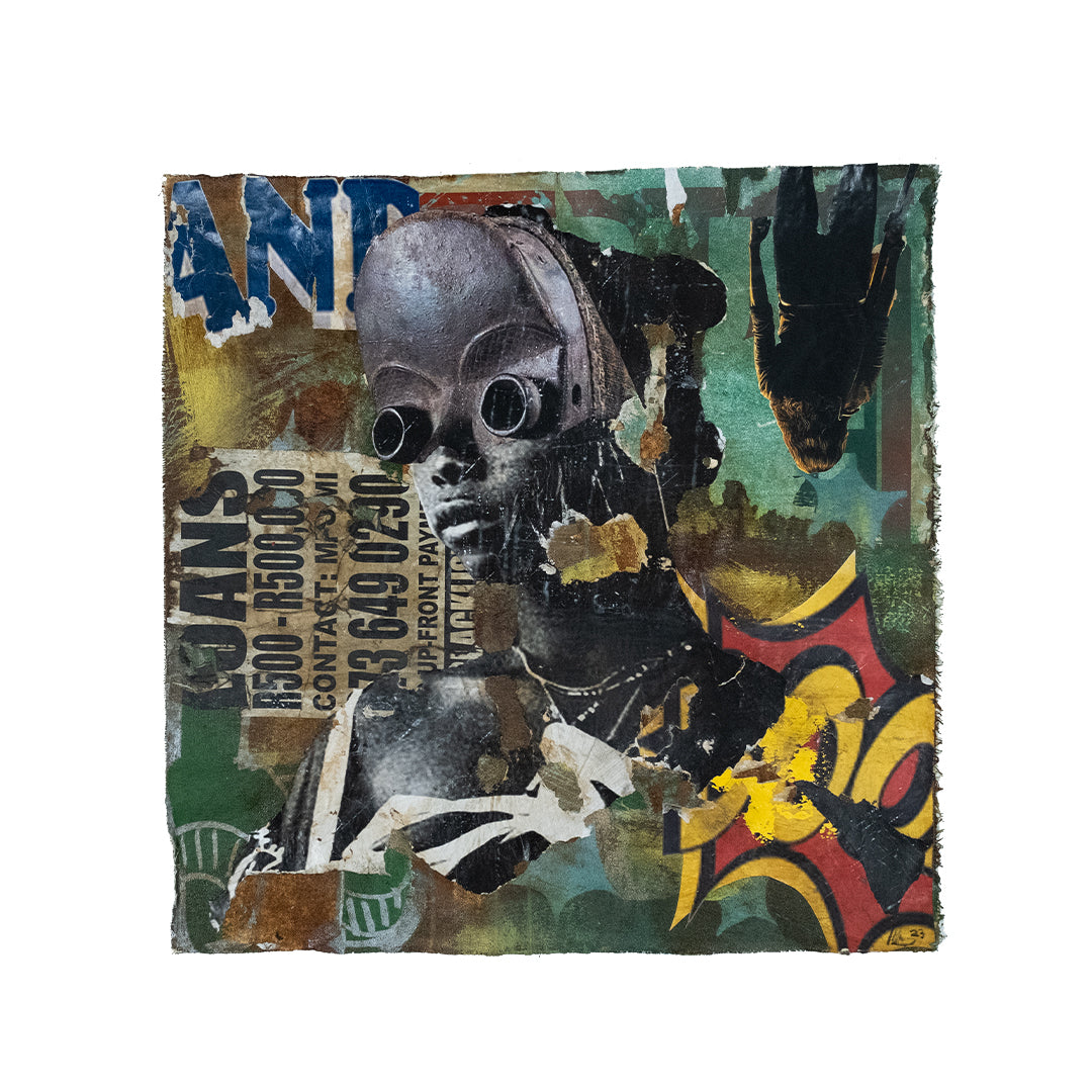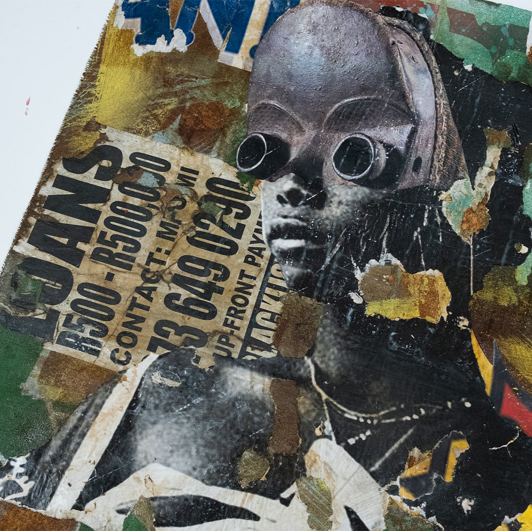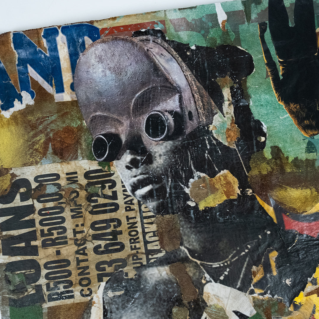Mncedi Madolo draws from print ads and magazine covers to satirize his attempts at selling fast solutions to complex problems. Mncedi’s s layered works are of mixed-media underscores which depict the impact of advertisements on South African identity and it’s physical urban landscapes.