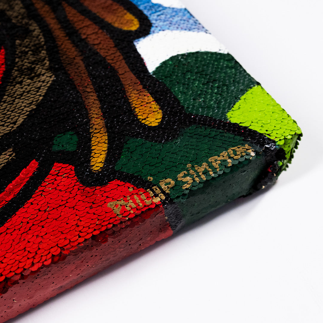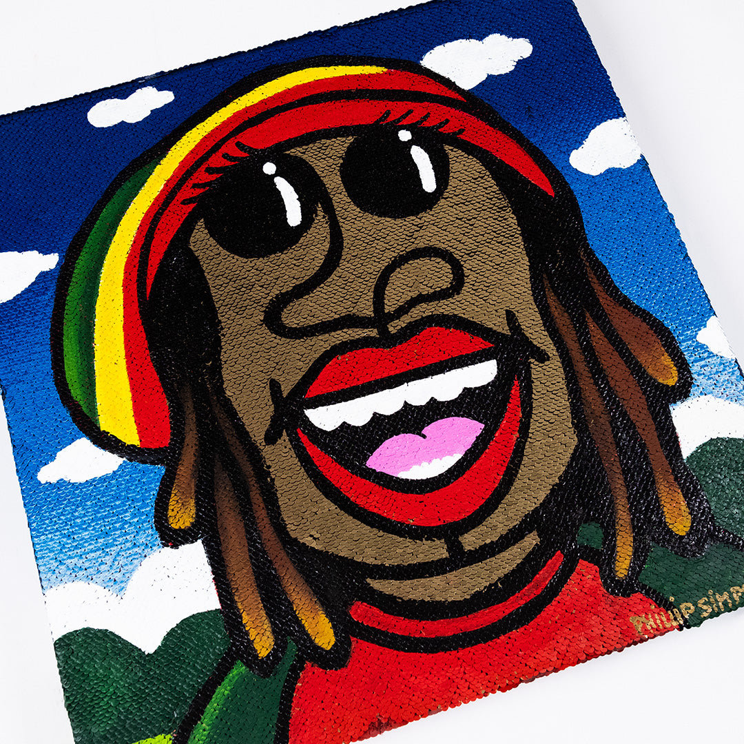 Jamaican Me Happy by Phil Simpson. Mixed Media on Panel. 18 x 18 Inches. This artwork was featured in the Murals in Islandview Group Show at Spot Lite Detroit (September 2023 - January 2024)