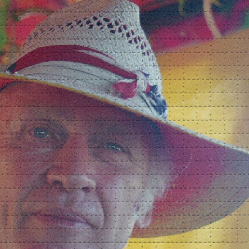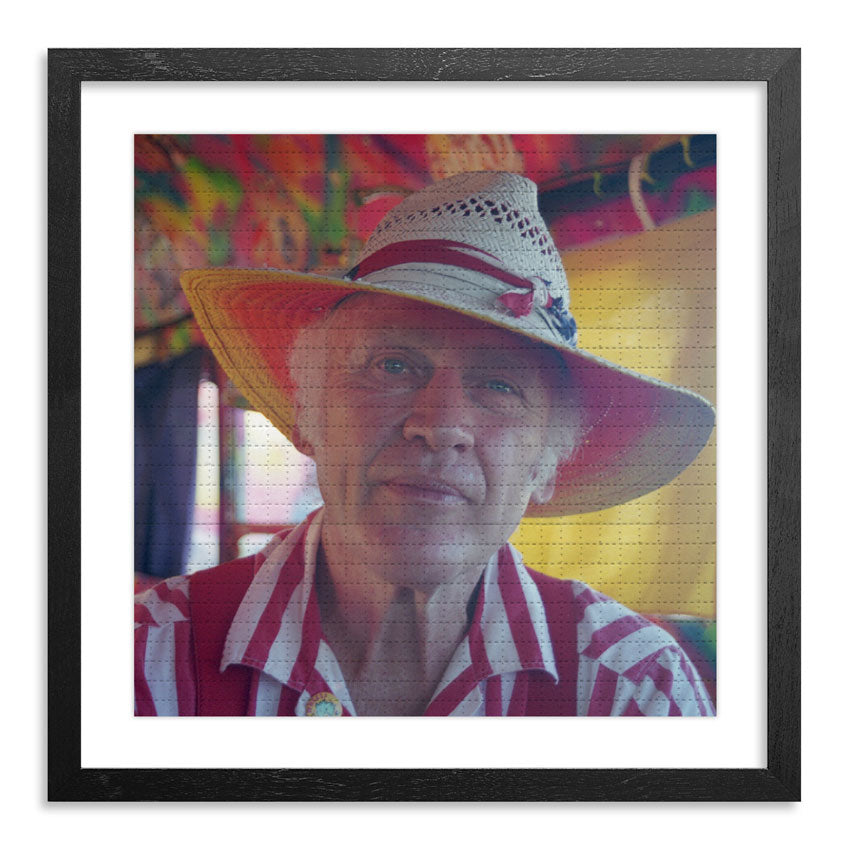 aKen Kesey Aboard Further, July 1998 by Roger Steffens / Family Acid. Limited-edition archival pigment print on perforated blotter paper. 7.5 x 7.5 inches.