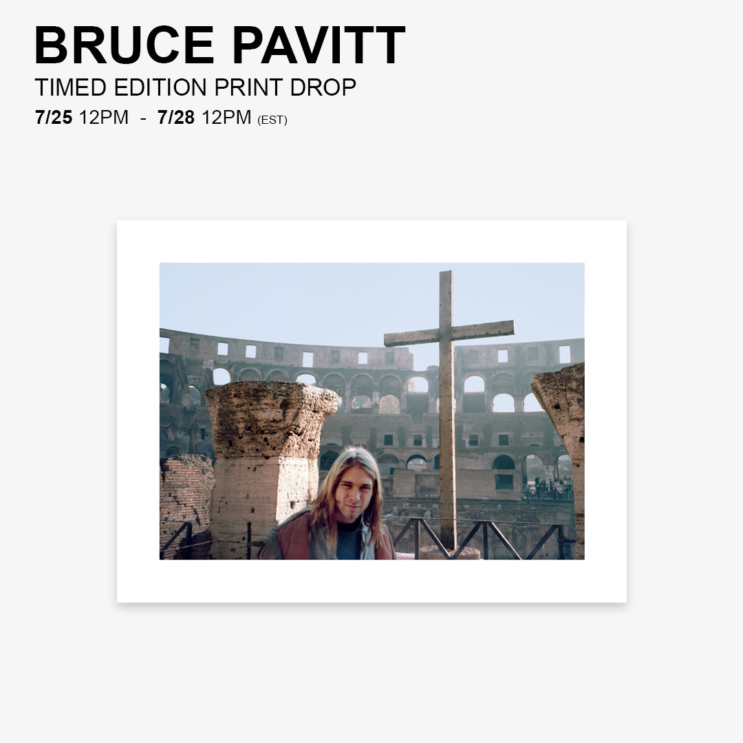 Kurt Cobain, Colloseum, Rome, November 28, 1989 by Bruce Pavitt. 12 x 9 inches. Archival Pigment Print on 290gsm Moab Entrada Fine Art Paper. Edition Size TBD. Each print comes numbered and signed by Bruce Pavitt and with a Certificate of Authenticity from 1XRUN.