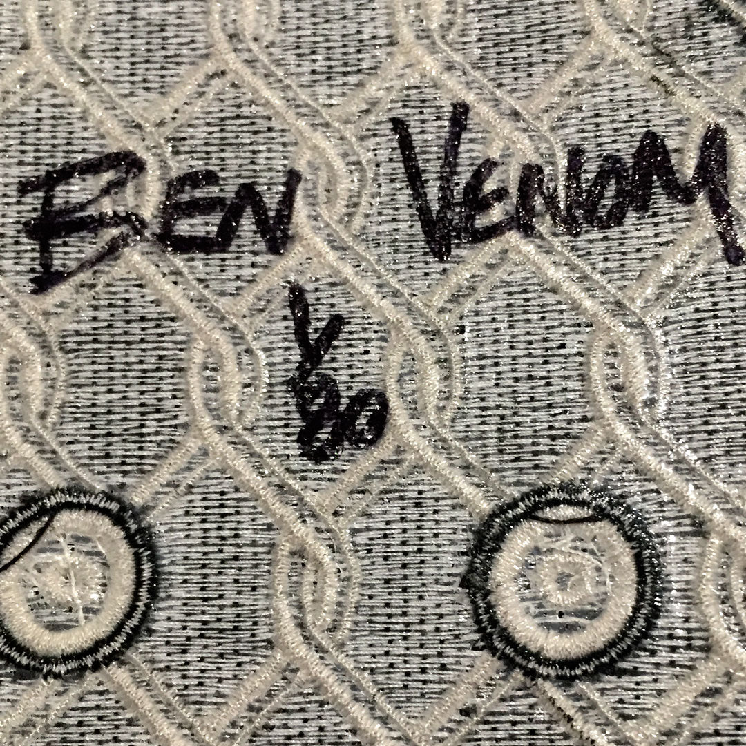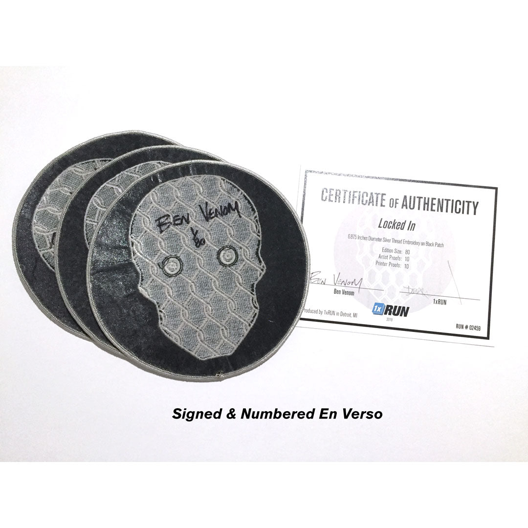 Locked In - Embroidered Patch by Ben Venom. Silver Thread Embroidery on Black Patch. Edition of 80. 6.975 Diameter. This RUN comes signed and numbered en verso, and includes a Certificate of Authenticity from Ben Venom and 1xRUN.