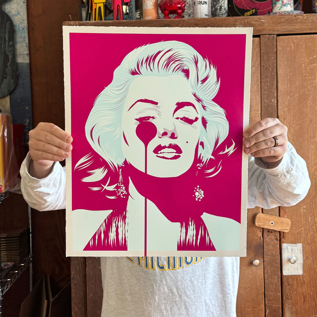 Marilyn Pure Joy - Oxblood Edition by Pure Evil . 16 x 20 inches. 3-Color Screen Print on Somerset Satin 300gsm. Edition Size TBD. Each print comes numbered and signed by Pure Evil and with a Certificate of Authenticity from 1XRUN