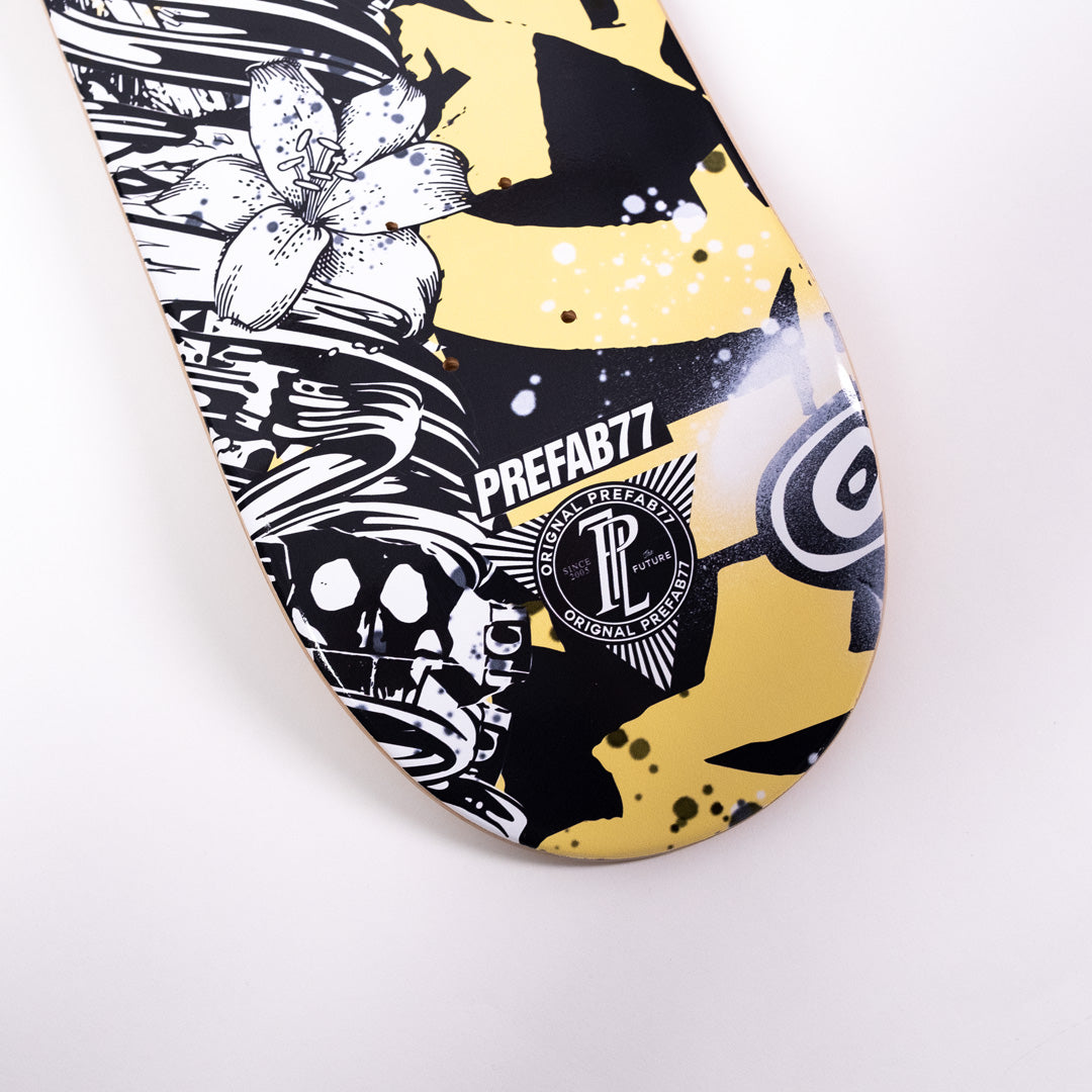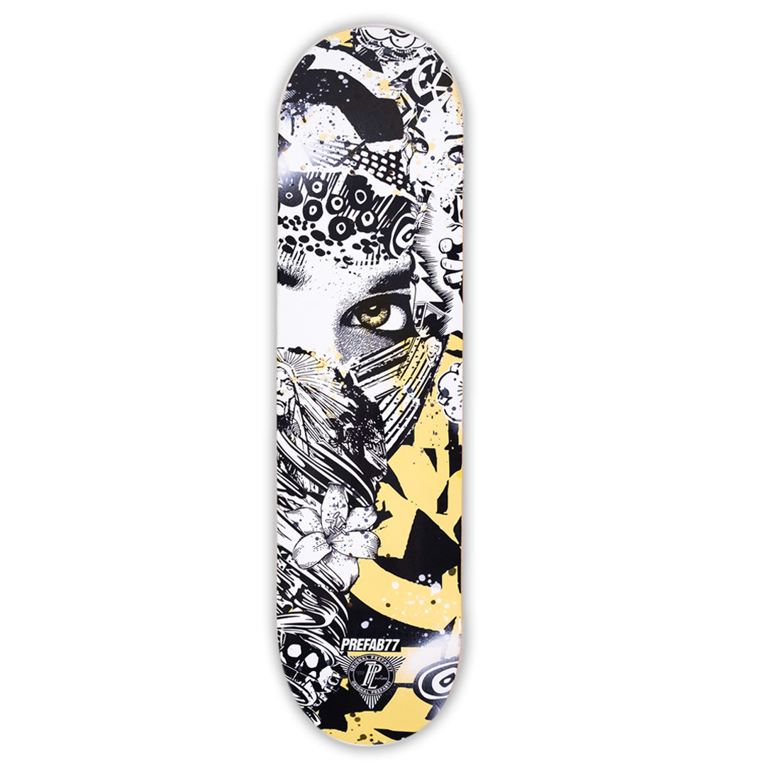 Mask I by Prefab77. Archival Pigment Print Transfer on Cold Pressed Steep Natural Skate Deck. Edition of 75. 8.25 x 31.875 Inches. This RUN includes a Certificate of Authenticity from Prefab77 and 1xRUN.
