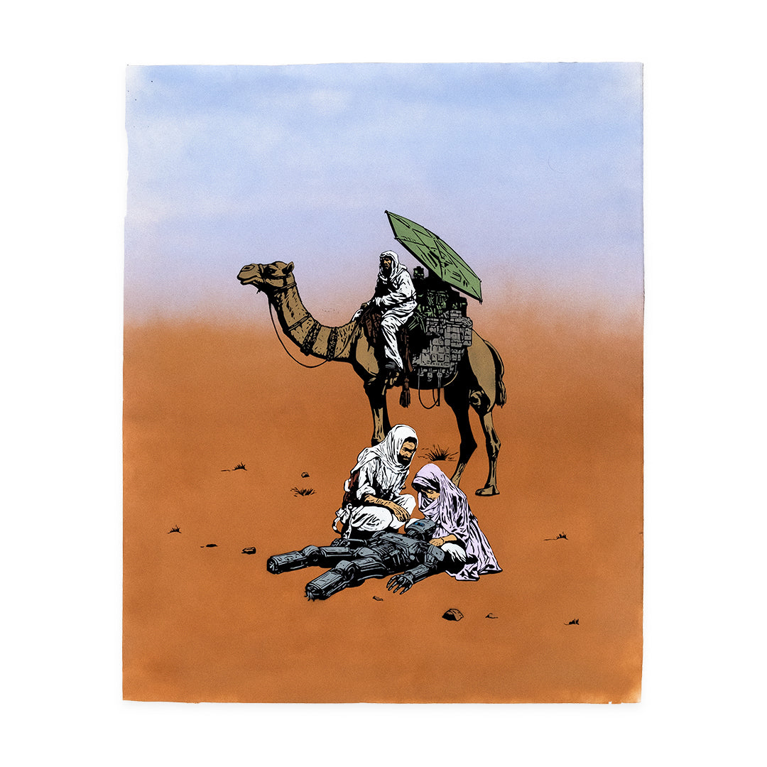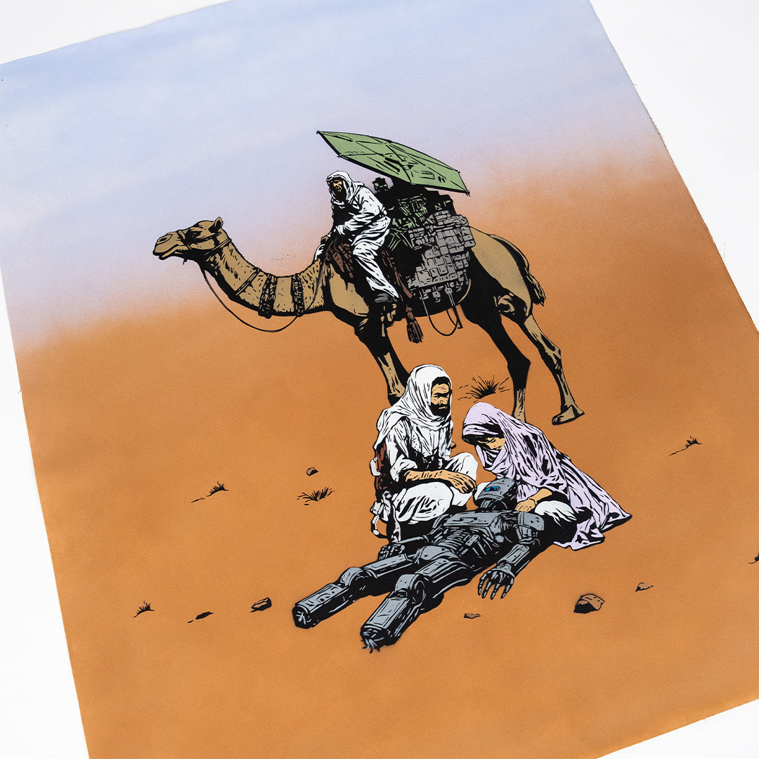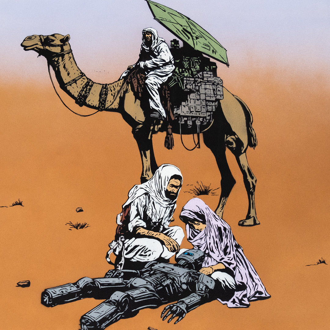 In 'Mechanical Lament,' a nomad and a robot cross paths in the desert. Their meeting, wordless yet profound, tells a story of tradition meeting technology, inviting you to ponder the connection between our heritage and the future we forge.