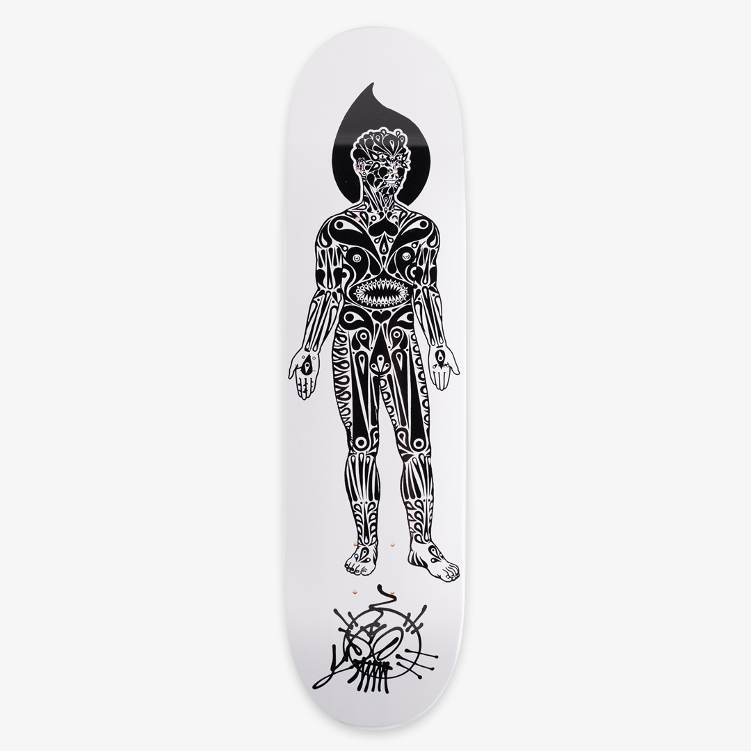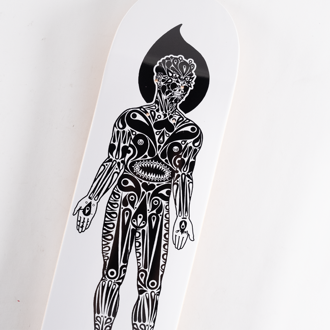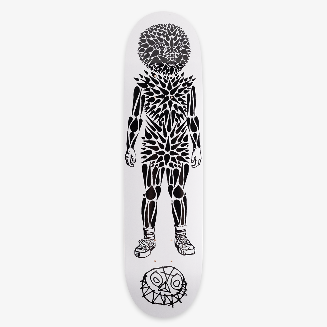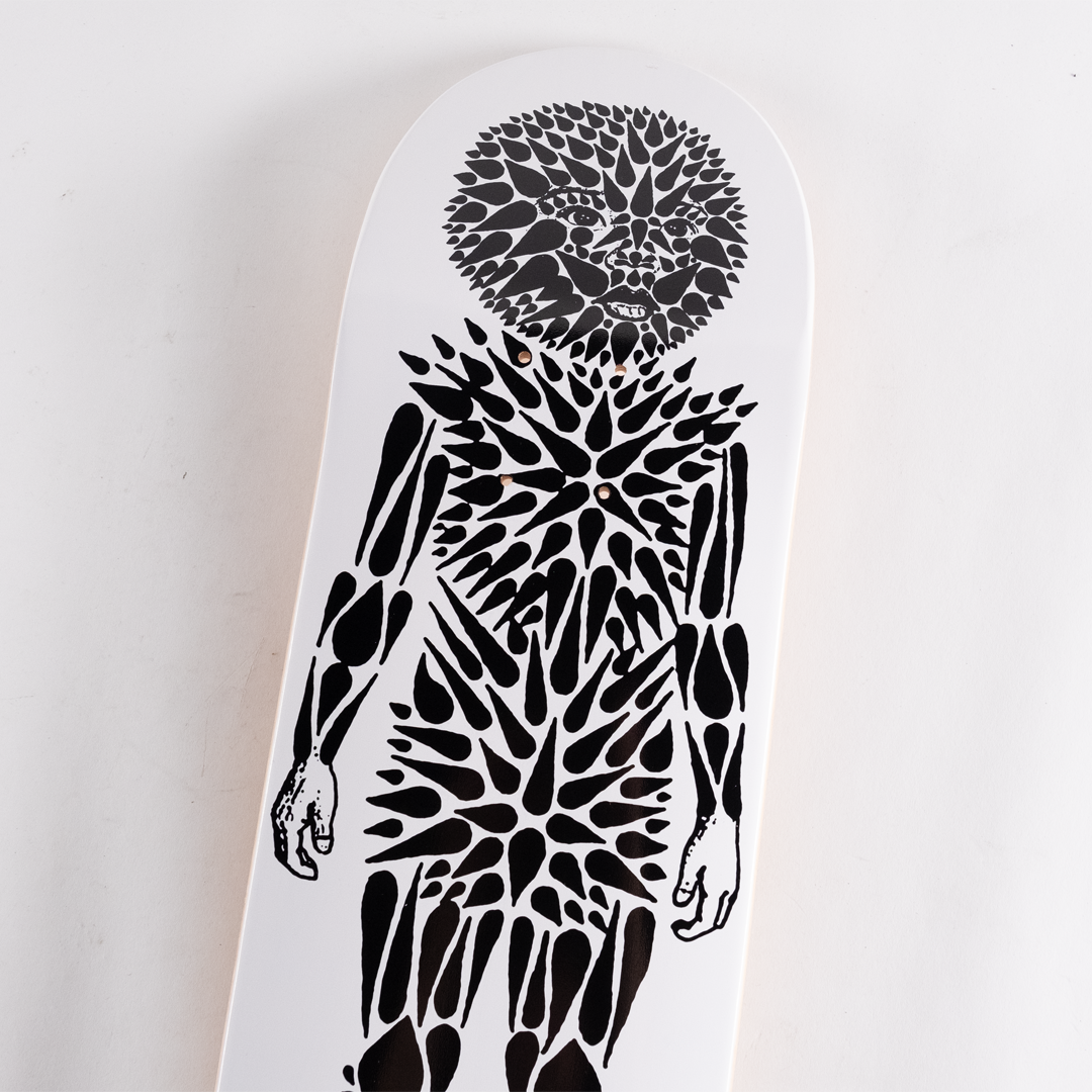 Prickly Street Boy + Anatomy of a Thorny Body Gray Variant Skate Deck Set by Stinkfish. (2) 8 x 31.88 in skate decks. Archival Pigment Print Transfer on Cold Pressed Steep Natural Skate Deck. Edition Size TBD.