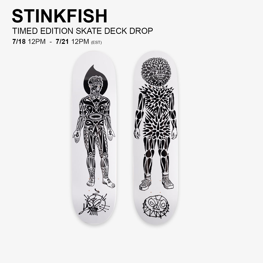 Timed Edition Skate Deck Set. This edition drops 7/18/25 @ 12pm (est) and is available to purchase until 7/21/25 @ 12pm (est). Edition size is determined by sales. Orders will start shipping by mid to late September. Each deck comes with a certificate of authenticity signed by Stinkfish and 1XRUN.