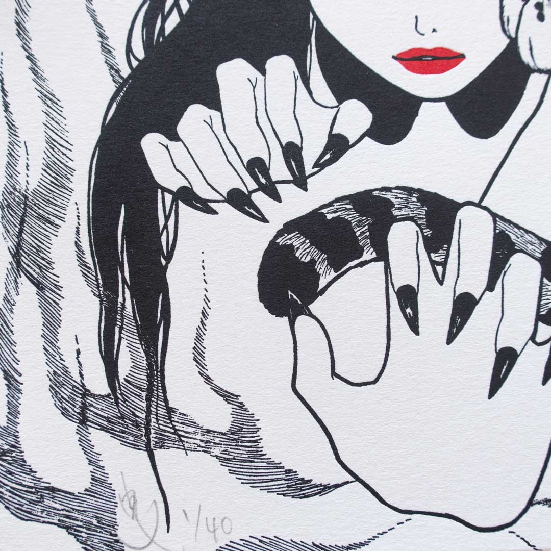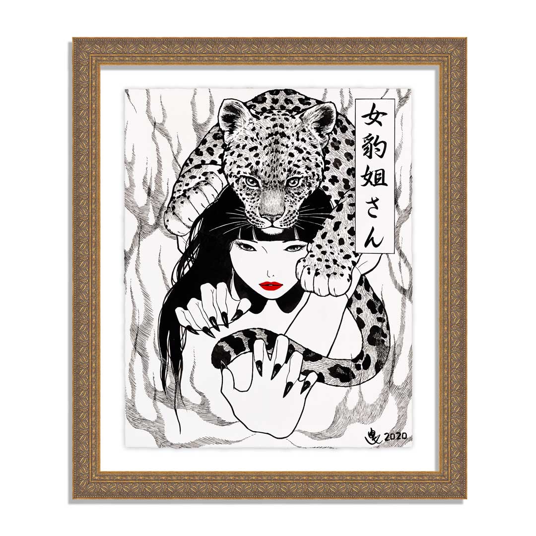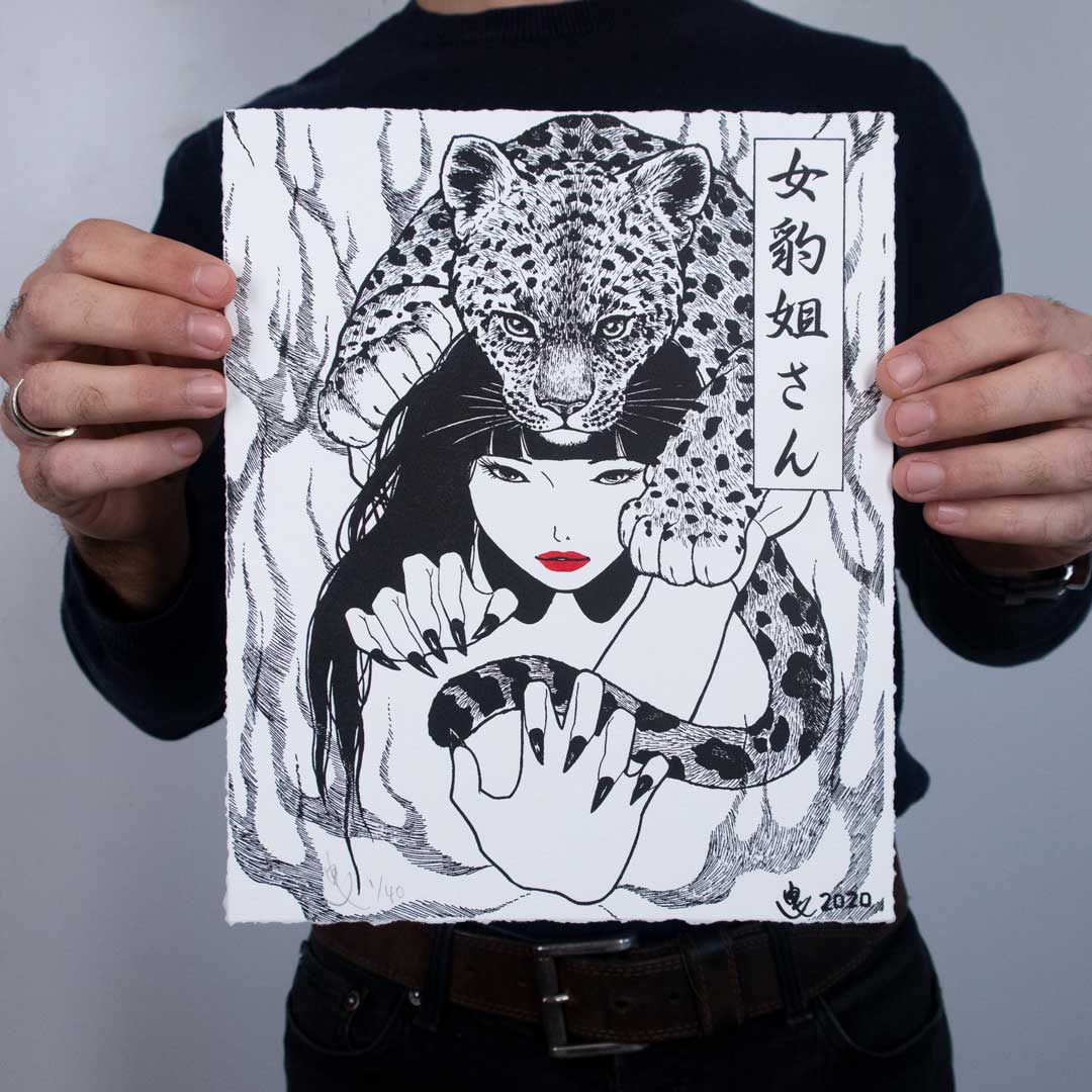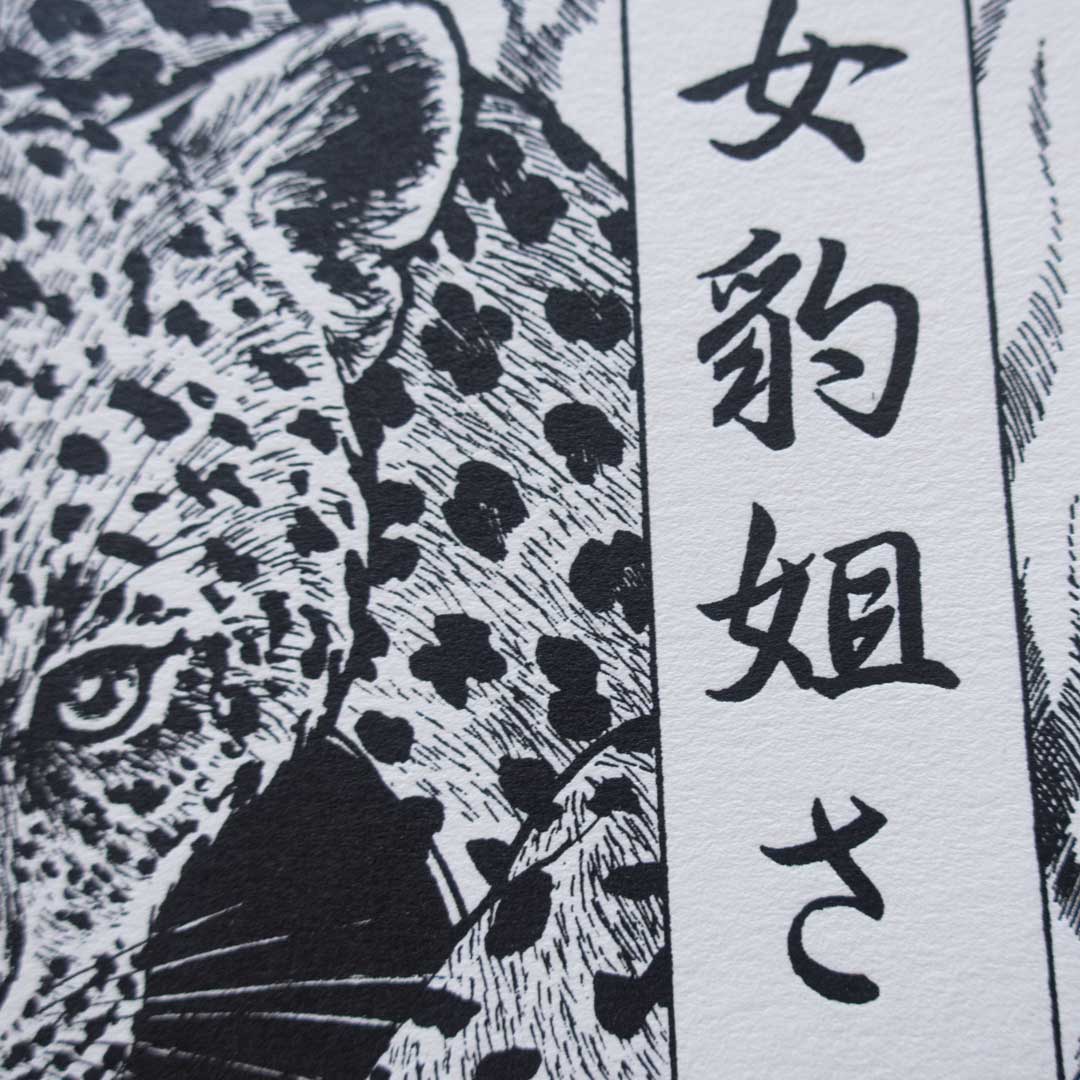 Sister Leopardess - Letter Press Edition by Yumiko Kayukawa. 2-Color Letter Press on Hand-Deckled Coventry Rag Paper. Edition of 40. 8 x 10 Inches. This RUN is signed, numbered and comes with a Certificate of Authenticity from Yumiko Kayukawa and 1xRUN.