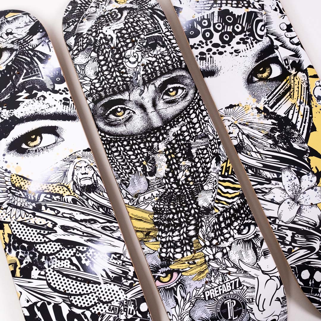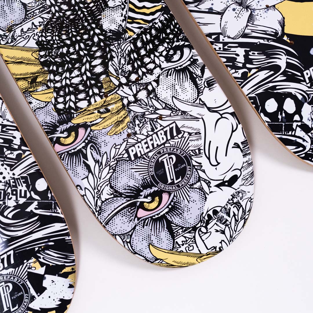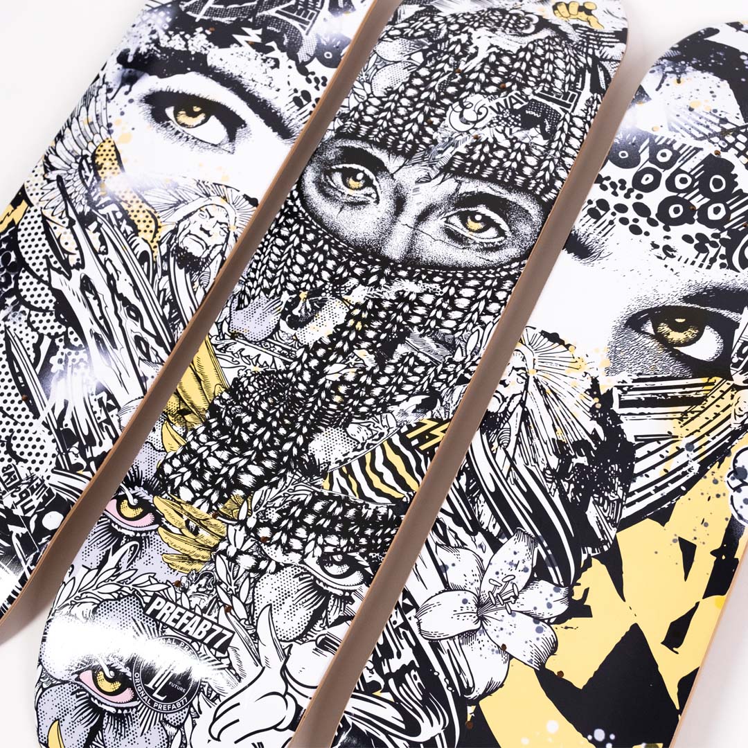 Skate deck set by Prefab77. Archival Pigment Print Transfers on Cold Pressed Steep Natural Skate Decks. 8 x 31.875 Inches. Hand-numbered and includes COA.