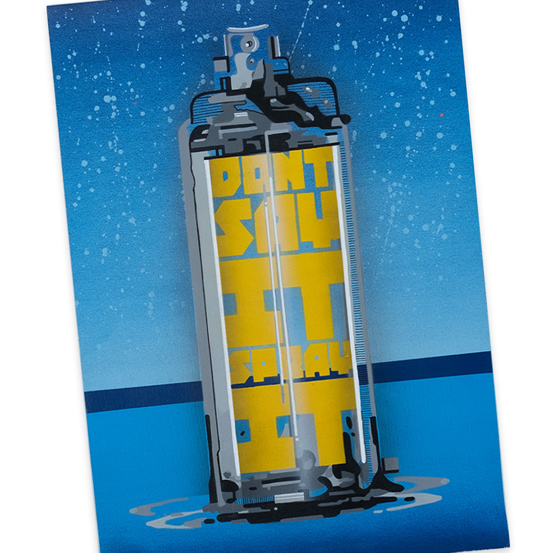 Spray It Don't Say It (Blue Edition) by Mars. Acrylic and ink on unstretched canvas. Edition of 1. 12 x 16 Inches. This RUN comes signed with a Letter of Provenance.