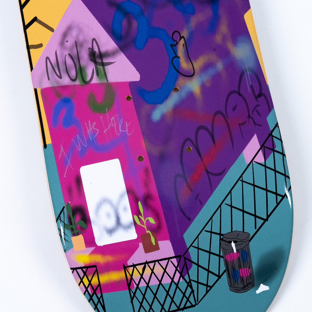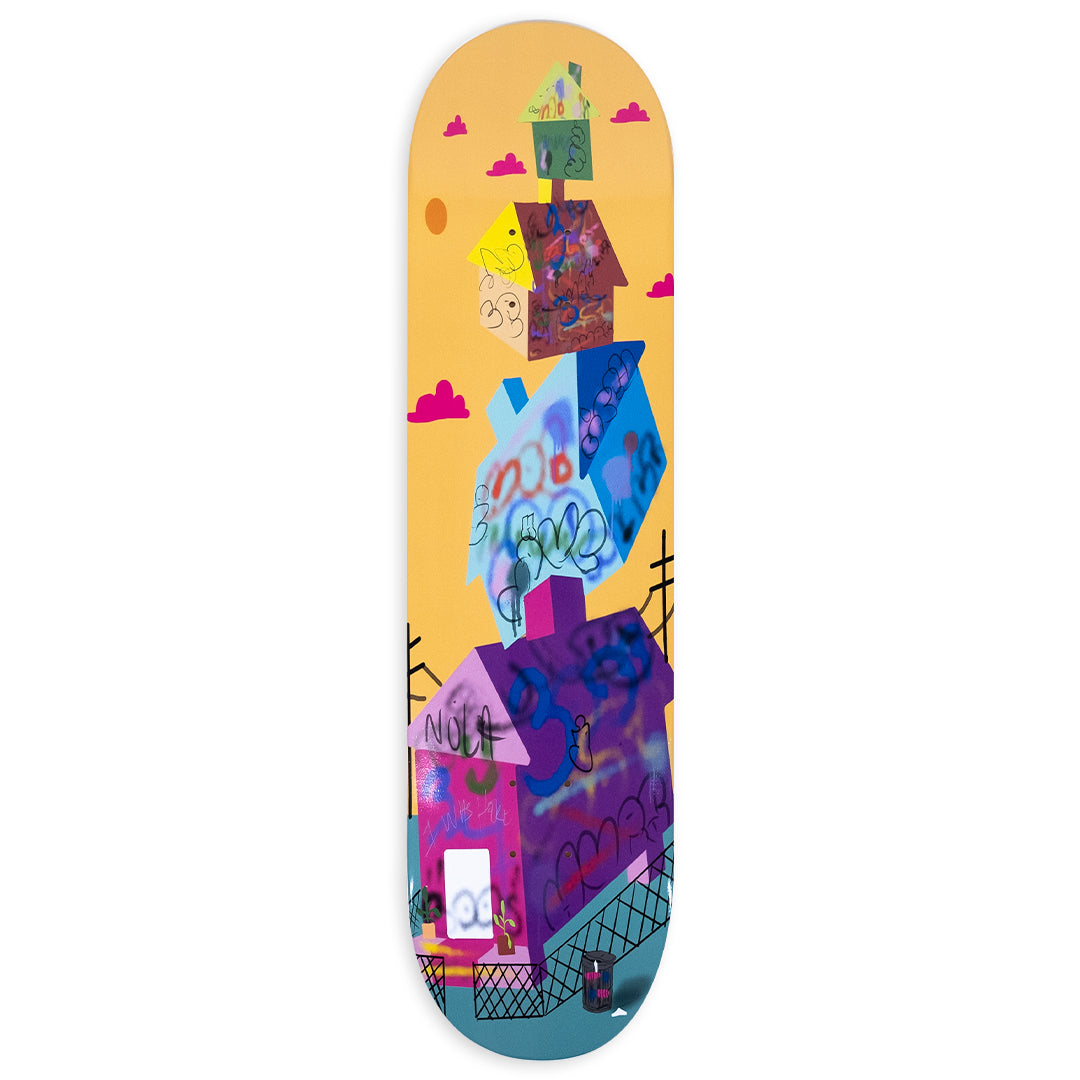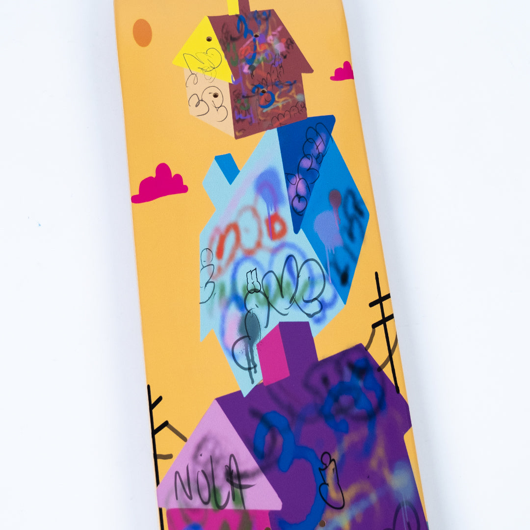 Stacked Houses by Jay McKay. Archival Pigment Print Transfer on Cold Pressed Steep Natural Skate Deck. Edition of 35. 8.25 x 31.875 Inches. This RUN comes with a screen-printed signature, hand-numbering, and includes a Certificate of Authenticity from Jay McKay and 1xRUN.