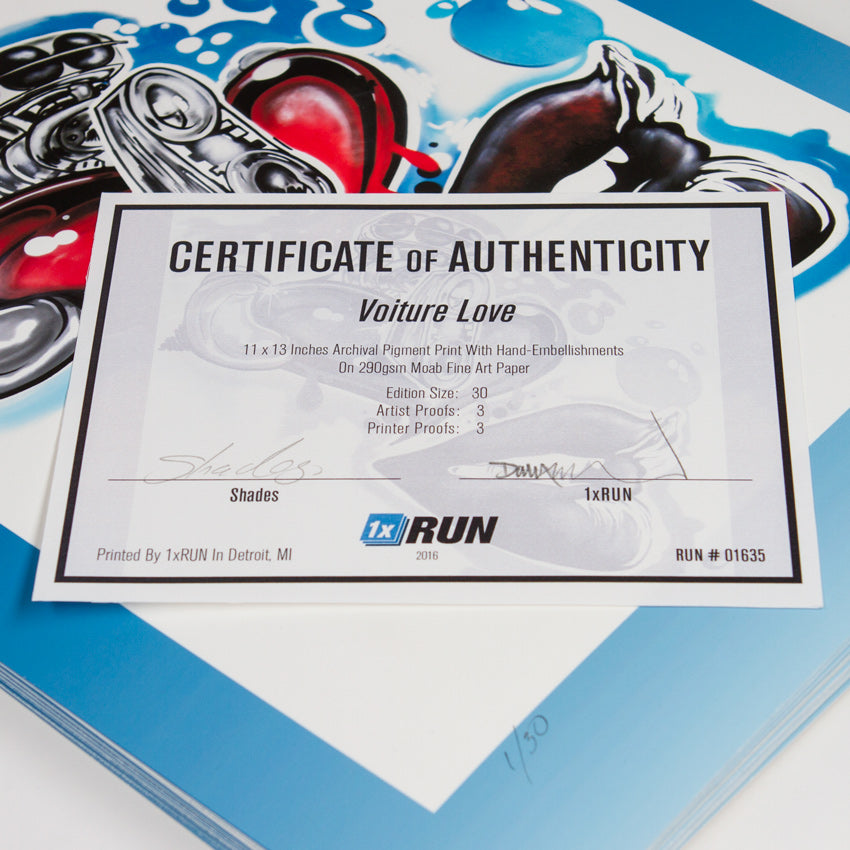 Voiture Love by Shades. Archival Pigment Print on 290gsm Moab Rag Fine Art Paper. Edition of 30. 11 x 13 Inches. This RUN comes signed and numbered with a Certificate of Authenticity from Shades and 1xRUN.