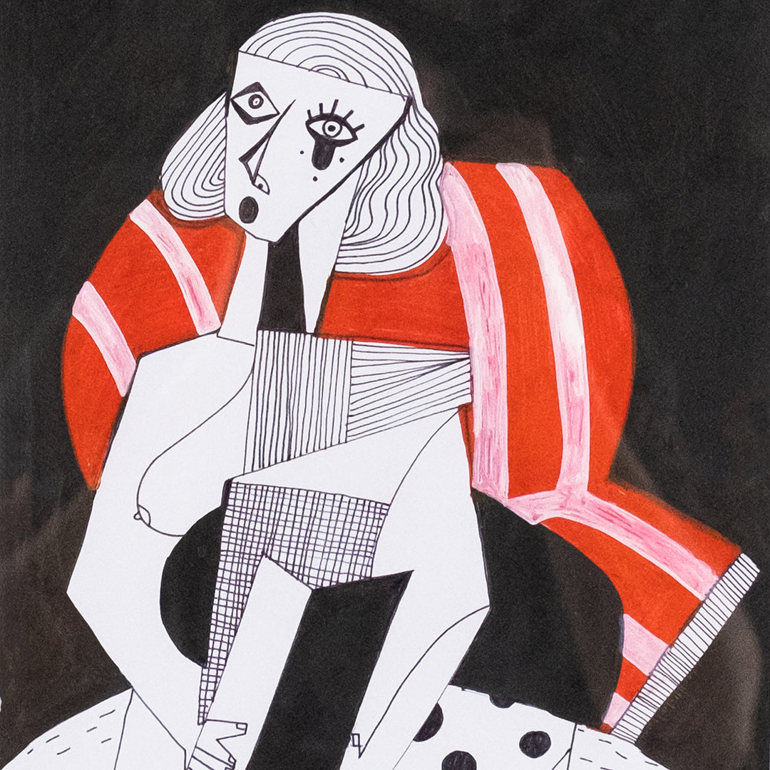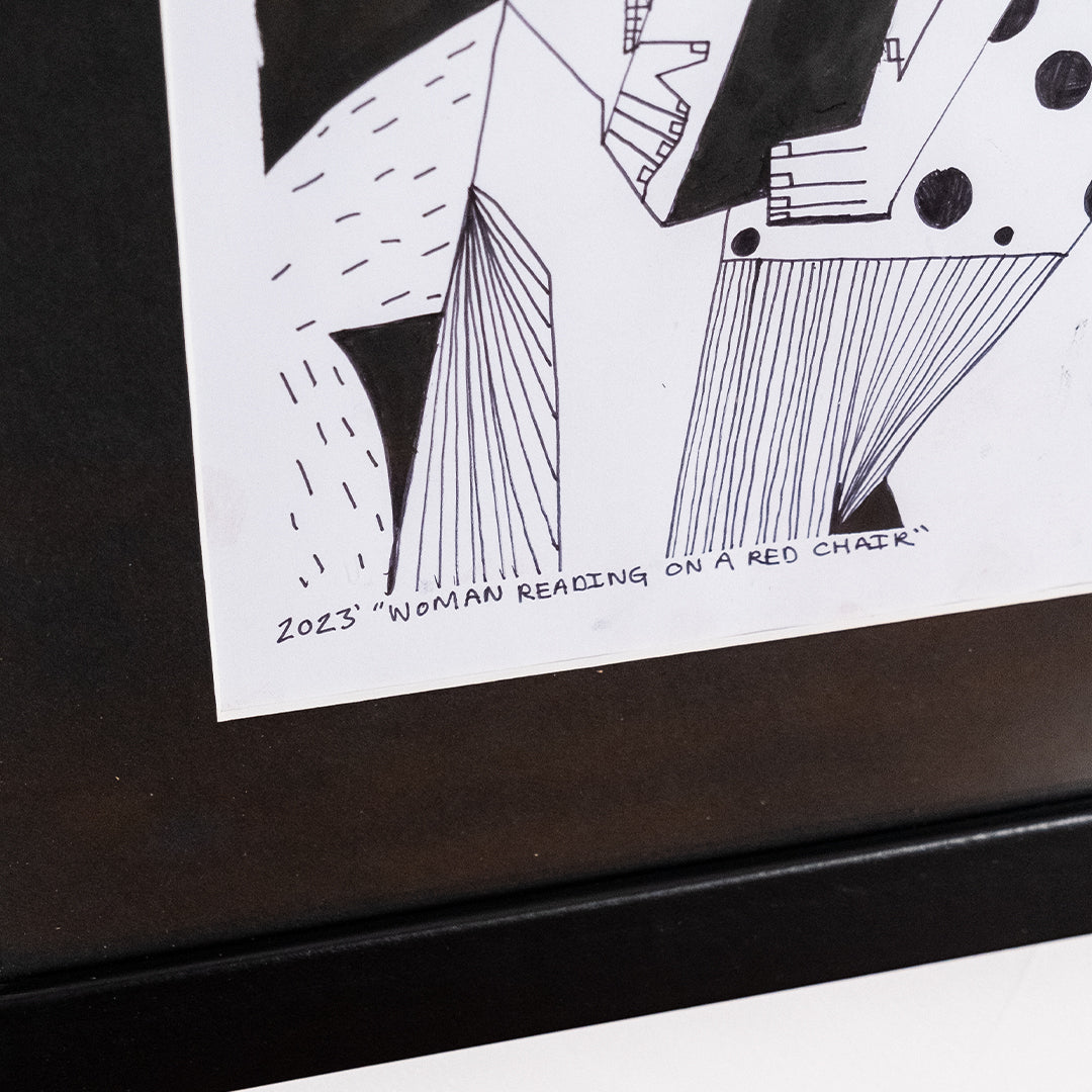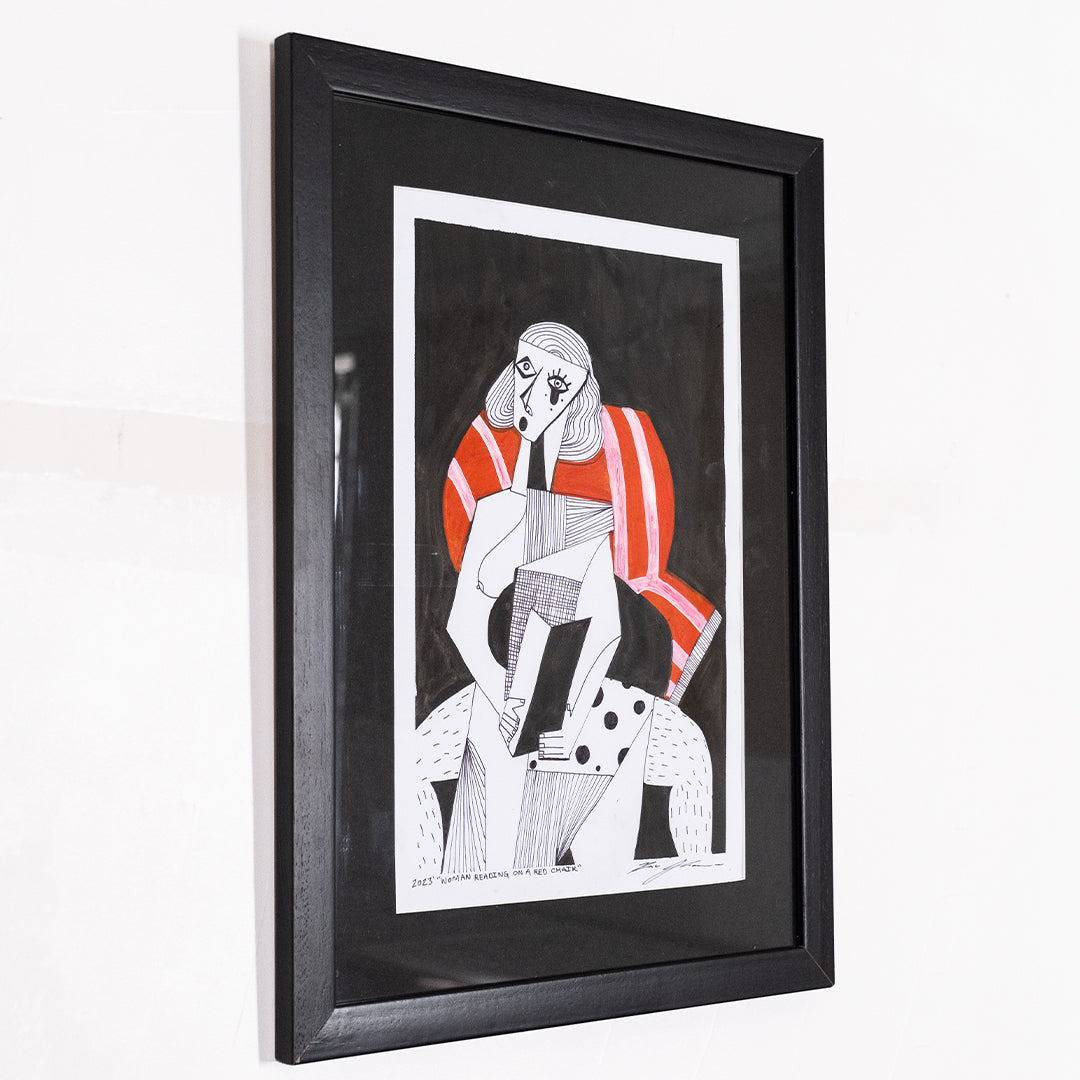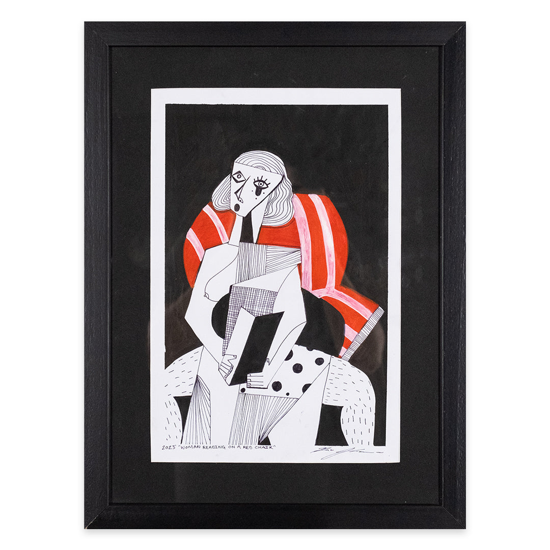 Woman Reading on a Red Chair by Ryan Shava. Ink on Paper Framed. 11.25 x 16.5 Inches (Artwork). 16.5 x 21.75 inches (frame)